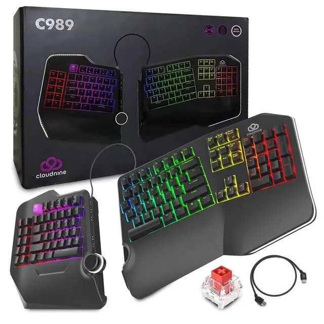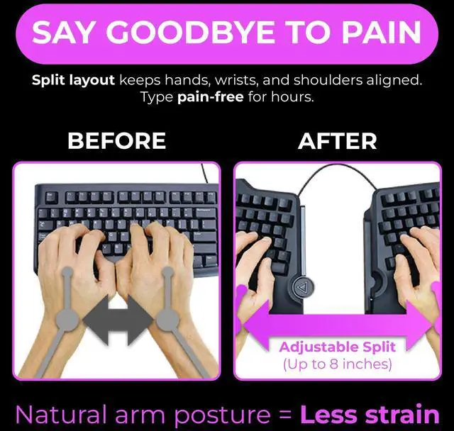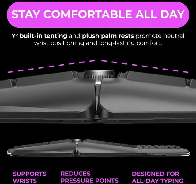 Split keyboard design helps eliminate wrist and shoulder pain while you type. By keeping your hands and arms properly aligned, this ergo keyboard helps provide pain-free typing for 8 plus hours a day. ^^ Built-in tenting and palm support ensures your hands stay comfortable all day. With 7 degrees of angle built into the wrist rests, this full-sized keyboard keeps you in typing bliss because your hands stay in their natural position. ^^ Do you suffer from sore wrists, RSI Symptoms, Carpal Tunnel, or Arthritis? This keyboard can help - It can be separated up to 8 inches keeping your arms & wrists ergonomically aligned.