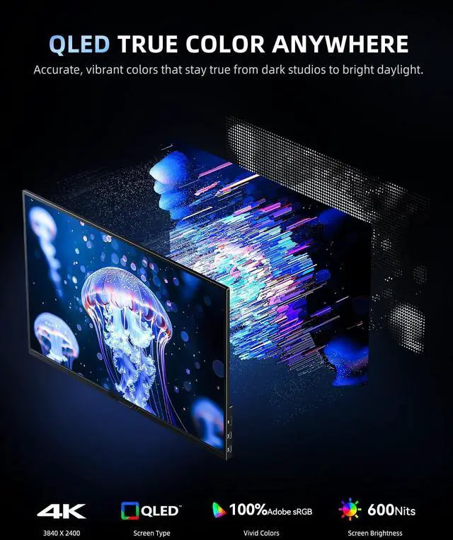 4K UHD Clarity with QLED Precision: Engineered with an ultra-detailed 3840×2400 resolution, this 4K portable monitor features QLED technology for enhanced color accuracy and vivid hues. Offering outstanding visual precision and sharpness for both work and entertainment, it's perfect as a second screen for laptops, mini PCs, or gaming consoles. Whether you're enhancing productivity or diving into immersive visuals, this portable monitor excels wherever you go.