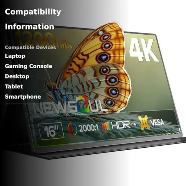 Newsoul Portable Monitor 4K 16" Laptop Monitor 1200Nits High Brightness, 2000:1 Contrast Fast IPS Matte Screen with VESA & Protective Case, Built-in USB-C HDMI Portable Screen for Phone Game Console