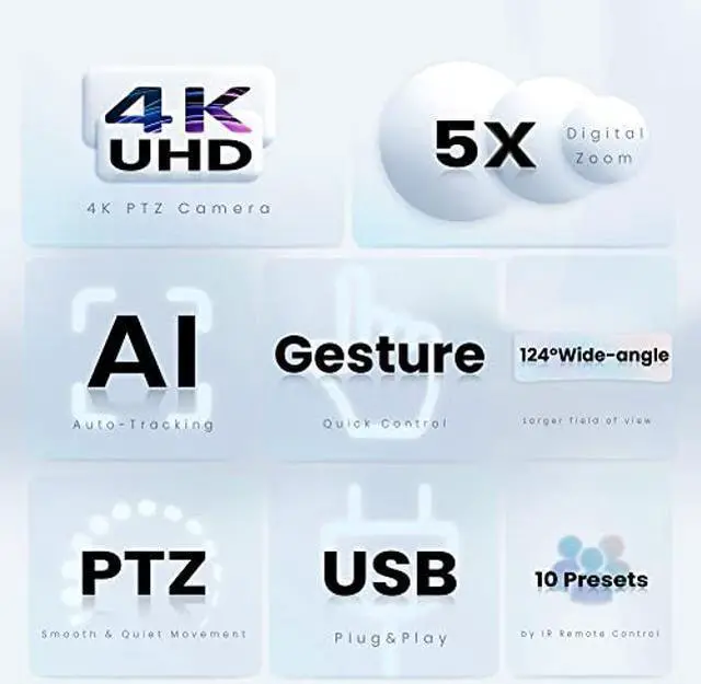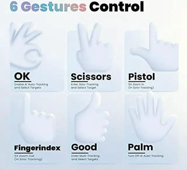 AI-Powered Auto-Tracking - Gestures enable AI auto-tracking and 5X digital zoom: 'OK' to AI-tracking ON and enter multi-human tracking, 'V' to enter solo-tracking, 'L' to zoom-in(in solo-tracking), 'One' to zoom-out(in solo-tracking),'Good' to enter multi-human tracking, 'Palm' to AI-tracking OFF.