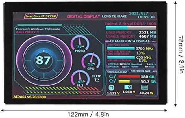 IPS Screen: 800x480 resolution, clear picture, can be placed inside or outside the case. Display not only CPU, GPU, RAM usage and temperature, but also internet speed, date, time, volume, weather forecast.