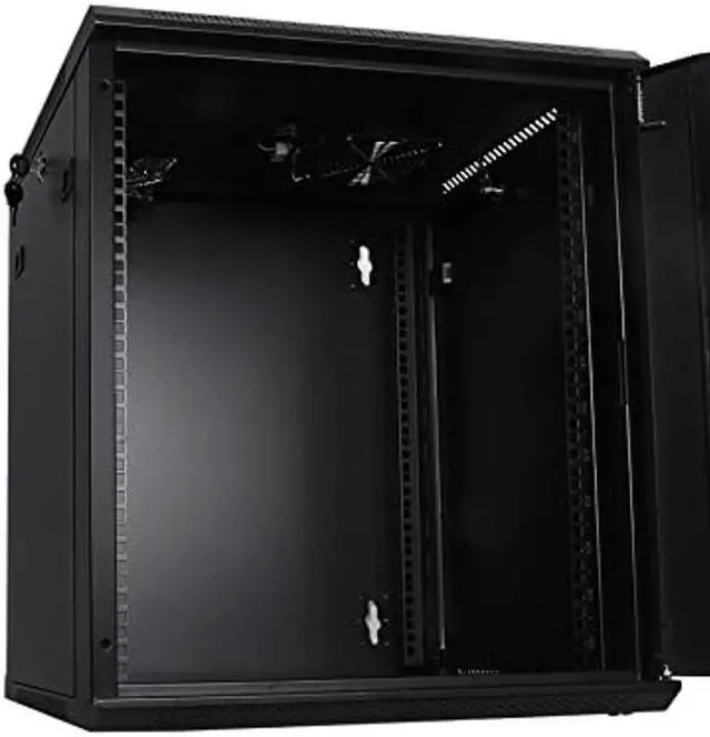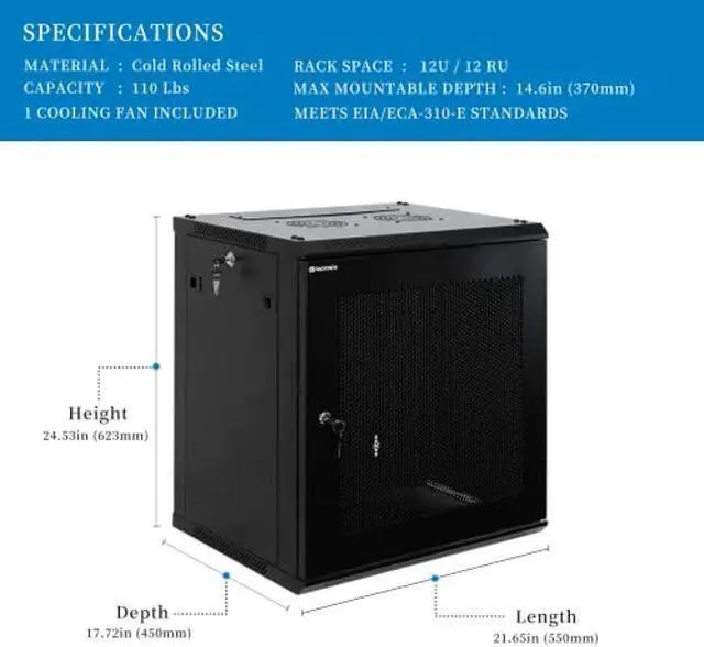 Dimensions: 21.65" Length x 17.72" Depth x 24.53" Height ; The wall mounting holes on the 6U cabinet are spaced 16 inches center to center for greater stability, matching standard construction framework