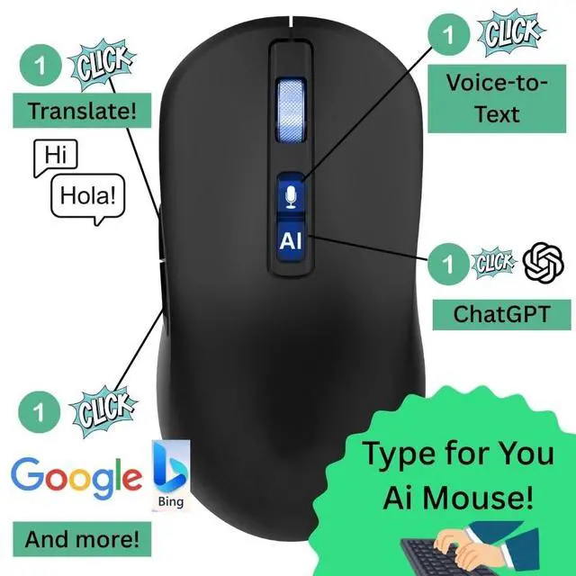 2025 AI Wireless Mouse with Translation for PC Laptop: Hands-free typing- ChatGPT Bluetooth Mouse, Voice AI, Ergonomic Multi-Translate, One Tap Google, USB Rechargeable High-Performance Office Device