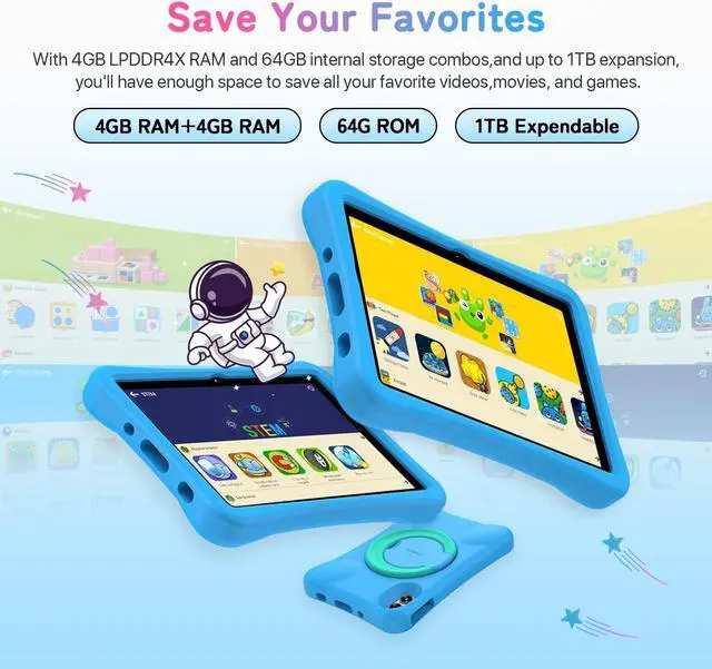 8GB (4+4 expansion) RAM + 64GB ROM + 1TB TFThe G1 Tab Android tablet uses the latest memory expansion technology to dramatically increase the memory running space from 4GB to 8GB, allowing the tablet to open more applications at the same time, and running at maximum efficiency. The Android kids tablet comes with 64GB ROM and up to 1TB of expandable microSD storage for even more space.