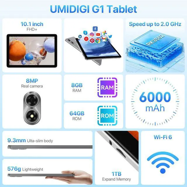 • - :UMIDIGI G1 tablet supports Wi-Fi 6 that improve the speed and stability of network connections. The tablet has dual-speaker, split-screen function, Bluetooth 5.0, FM radio, meeting the needs of online learning and video calls. More functions make you enjoy on-the-go fun and productivity.