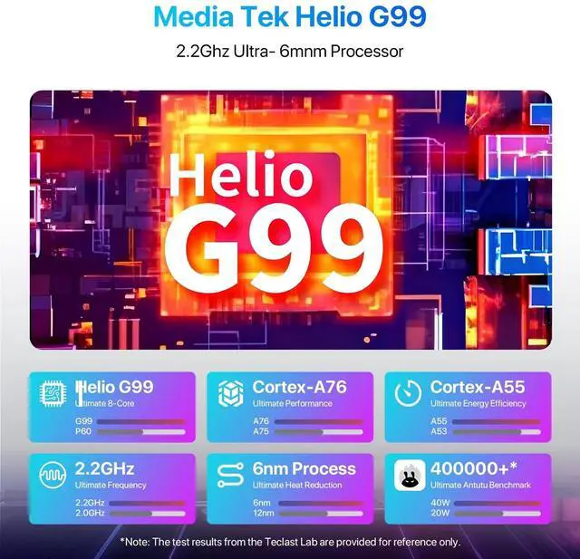 : UMIDIGI G7 Tab Pro with the high-performance MediaTek Helio G99 processor that delivers smooth multitasking and seamless performance, allowing you to effortlessly handle various tasks and apps. The 6nm process technology are more energy efficient.