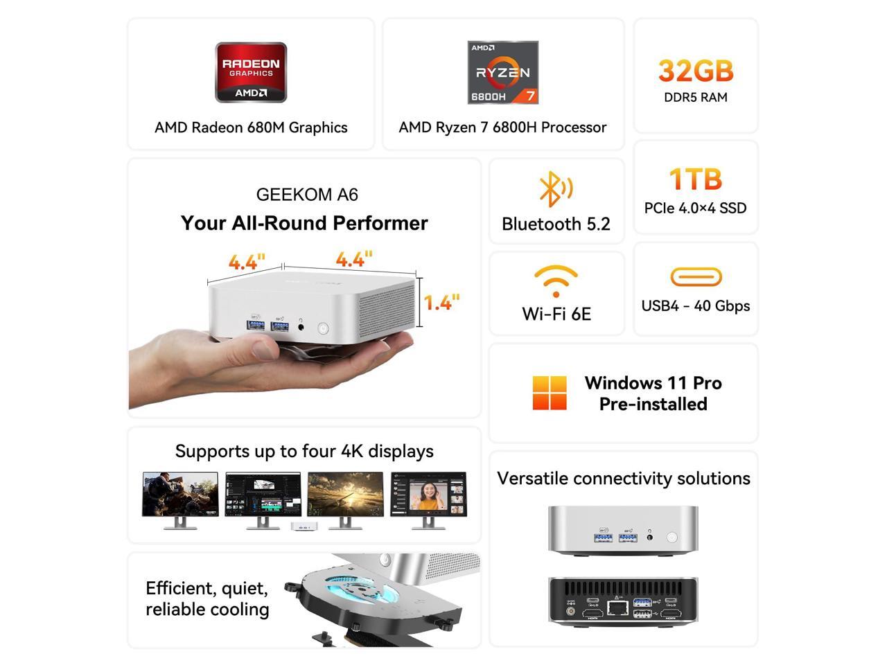 - Small but Mighty - The GEEKOM A6 Mini PC packs powerful performance into a compact 4x4x1.4-inch design, fitting seamlessly into any workspace. Its sleek aluminum-alloy chassis combines style and durability, while the AMD Ryzen 7 6800H processor delivers impressive speed and power in a small form factor.