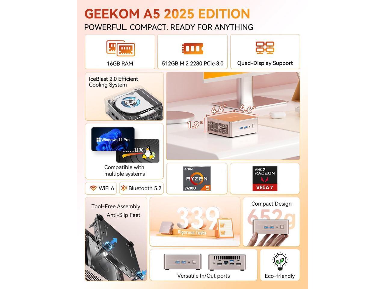 - [Mini Workhorse, Max Value] The GEEKOM A5 2025 Edition integrates an AMD Ryzen 5 7430U into a compact 4.6×4.4×1.9-inch metal chassis offering desktop-class performance in a space-saving form that tucks neatly behind monitors or tight workspaces. With 45W efficient power, this Windows 11 Pro mini PC effortlessly handles office tasks, 4K streaming, and light creative projects. Deploying for your business? Choose genuine, multi-certified GEEKOM devices (, , , ) for security and reliability. Contact for business pricing! ( , .)