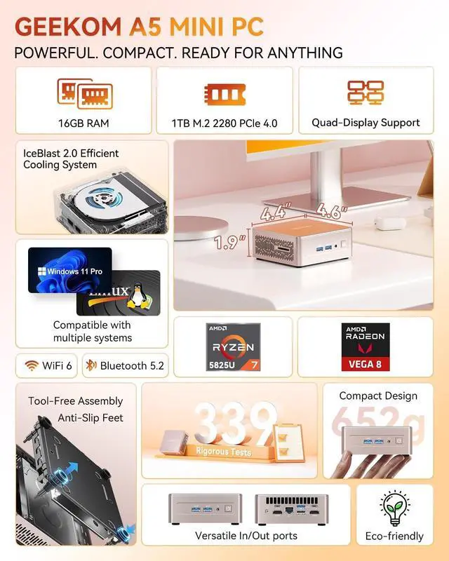 GEEKOM Technical Support: Choose the GEEKOM A5 for an eco-friendly option designed with sustainable materials and energy-efficient components that help reduce your carbon footprint. Backed by a 3-year limited warranty covering design and manufacturing defects, plus reliable support from our dedicated U. S. -based customer service team for a hassle-free experience you can count on ^^: & ^^.