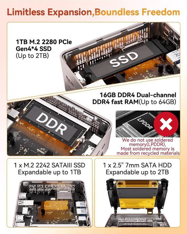 Last: Unlike the plastic shells you'll find on most mini pcs, geekom A5 mini pc features a triple-reinforced ABS+PC shell, precision-crafted metal frame and baseplateengineered to withstand up to 440 lbs of pressure for the perfect balance of strength and thermal efficiency. Tool-free upgrades, shock-absorbing feet, and a 3D antenna deliver true durability ^^,: Unlike mini PCs that utilize soldered RAM (typically made from recycled materials, non-upgradable, prone to instability issues, and have a limited lifespan), the GEEKOM A5 features a high-performance 16GB dual-channel DDR4 RAM slot crafted from all new materials and processed using standard techniques. It is truly upgradable to 64GB, utilizing higher-tier components for enhanced stability and supporting sustained performance growth over the years. Coupled with a 1TB PCIe SSD (expandable to 2TB) and additional storage slots, providing ample storage for system files and games. ^^ 4-Screen Display & 8K