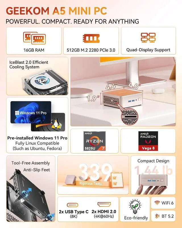 Perfect for professionalsseamlessly edit 4K videos, code, analyze data, or stream content across multiple screens, all without lag. ^^ [WiFi 6 & Bluetooth 5.2 ] Wi-Fi 6 (3x faster than Wi-Fi 5) delivers ultra-stable connections for 4K streaming, video calls, and large file transfersno buffering, no dropouts. Bluetooth 5.2 ensures instant, low-latency pairing with wireless headphones, keyboards, and more. ^^ [Versatile OS, Eco-Focus] The GEEKOM A5 comes and provides maximum versatility by supporting. Make an - with its sustainable materials and low-power design.