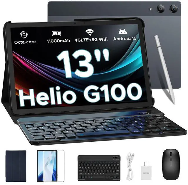 Weight: 718g ^^ + DOOGEE Tab E3 Pro 13 inch tablet is equipped with the latest Android 15 system, which enhances multitasking processing capability, supports screen splitting and WPS Office use, ensuring users efficient work and study processing. The eight-core Helio G100 chip offers superior data processing performance compared to the previous generation and excellent graphics processing capability--DOOGEE gaming tablet With Sim Tab E3 Pro ^^ -- DOOGEE Tab E3 Pro Gaming Tablets includes a Bluetooth keyboard, a mouse, a stylus pen, a screen protector, a protective case, a charger and other accessories. You can easily switch to PC mode for PC-level efficient work experience. Tab E3 Pro Android 15 tablet protective case provides drop and scratch protection while also working as a stand ^^ + + DOOGEE Tab E3 Pro Tablet with Keyboard comes with a massive 11000mAh battery that powers through long hours of streaming, gaming, and work. With 18W fast charging, youll spend less time plugged in and more time doing what you love. Plus, OTG support allows easy file transfer and reverse chargingperfect for staying productive and connected on the go ^^ ++ DOOGEE Tab E3 Pro 13 inch Android tablet features a built-in 1217 BOX quad-speaker system, with each speaker professionally tuned for balanced sound that delivers exceptional, immersive audio.