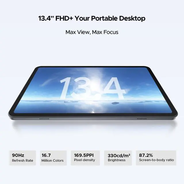 Android 16 + Gemini AIExperience the advanced Android 16 tablet system integrated with next-generation Gemini AI technology. This intelligent combination optimizes performance based on your usage patterns, enabling smoother multitasking and efficient power management. As a capable android tablet, the UNISOC T7280 octa-core processor delivers responsive performance for various applications. The DOOGEE Tab G6 Max incorporates modern android 16 tablet features, including enhanced security, automatic updates, and wide language support for ongoing system improvement and global usability. ^^ 13.4 -inch Display + 7.7 mm Ultra-Thin + 90Hz Refresh RateEnjoy content on a 13.4 -inch FHD+ IPS large tablet with 90Hz refresh rate for smoother visual performance.