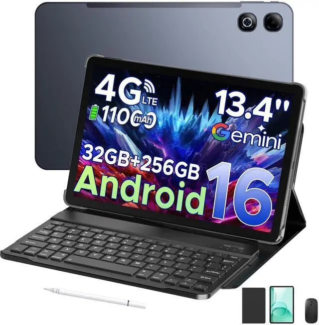 A responsive and energy-efficient choice for daily use and beyond. ^^ ++ Take sharp, detailed photos and videos with the 13MP rear camera, and look your best on calls with the 8MP front cameraboth supporting 1080P video recording. Combined with high-quality dual stereo speakers, enjoy an immersive audiovisual experience whether you're watching Netflix, attending Zoom meetings, or listening to music. This android tablet with keyboard is great for creators, communicators, and media lovers. ^^. + + + The android tablet included what others leave out: a 3.5 mm headphone jack for your favorite headphones, fast and secure Face Unlock, and Widevine L1 certification for HD streaming on Netflix, Prime Video, and more. With dual nano-SIM support (or SIM + microSD up to 2TB), you get ultimate flexibility for connectivity and storage. Everything you need, built into one sleek device. ^^, The DOOGEE Tab G6 MAX 13 inch tablet comes fully equipped with essential accessories, including a Bluetooth keyboard, mouse, stylus pen, screen protector, protective case, and chargereverything you need right out of the box. Effortlessly switch to PC mode for a desktop-like work experience. The included protective case not only shields your android tablet from drops and scratches but also doubles as a convenient stand, enhancing comfort for typing, streaming, or video calls.