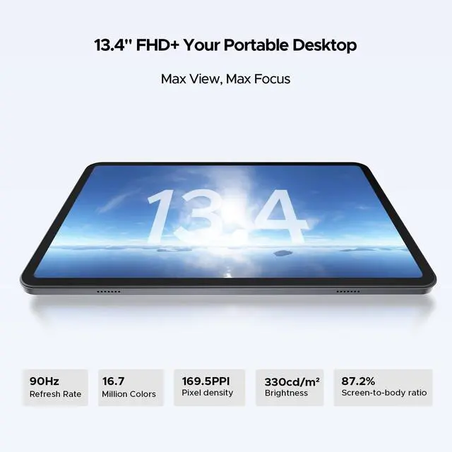 Enjoy a theater-like viewing experience on the stunning 13.4 -inch IPS display with Full HD+ resolution and smooth 90Hz refresh rate. The ultra-thin 7.7 mm metal design and 86.4 % screen-to-body ratio make it as elegant as it is immersive. Ideal for streaming movies, playing games, or multitasking with buttery-smooth visuals. Lightweight and sleek, this gaming tabet is the perfect companion for entertainment on the go. ^^ + + Never slow down with groundbreaking 32GB RAM (6GB + 26GB extended) and 256GB of high-speed UFS storageexpandable up to 2TB with a microSD card.