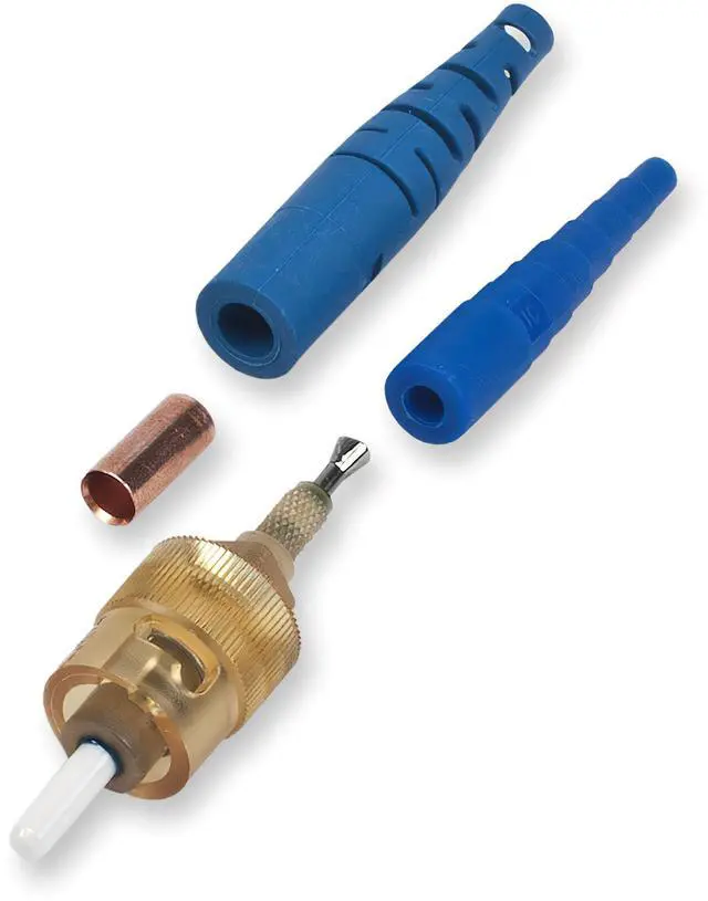 Corning 95-200-51 UniCam Connectors, ST compatible; Single-mode OS2 Pretium Fiber Optic Connector; Amber Housing, Blue Boot; Field-Installable; Corning LogoThe Corning UniCam 95-200-51 ST Compatible Single Mode Fiber Optic Connector is a high-performance, field-installable solution designed for fast and reliable fiber optic network terminations. With no epoxy or polishing required, this connector offers a quick, cost-effective installation process while maintaining exceptional optical performance. Its durable design and wide operating temperature range make it ideal for various applications, ensuring long-lasting reliability and efficiencyKey