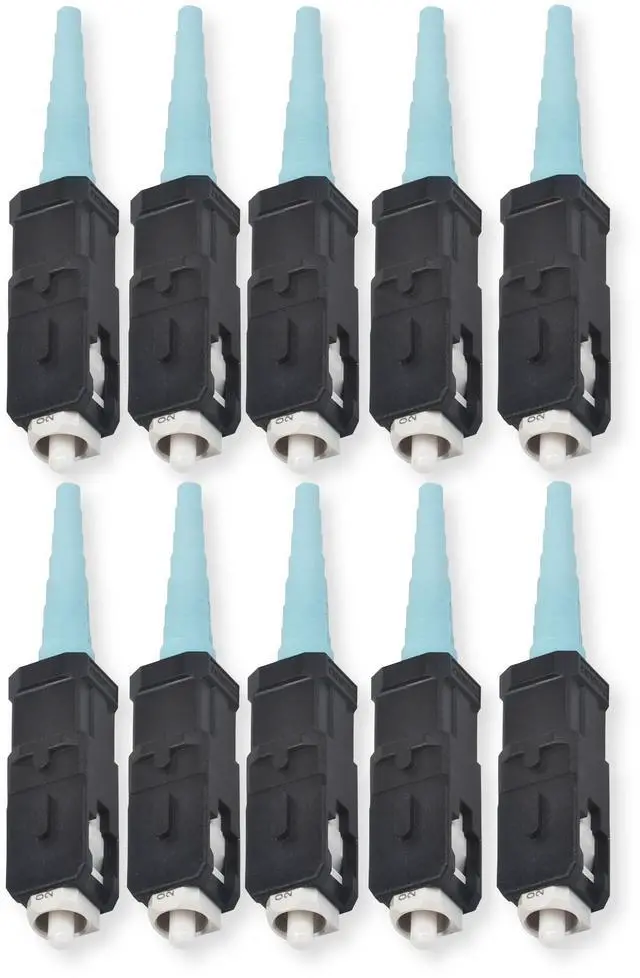 Key Features: Pack of 10 field-installable SC connectors Compatible with 50 m multimode OM3/OM4 fiber No epoxy, no polish installation process Typical insertion loss of 0.1 dB Maximum insertion loss of 0.5 dB Ceramic ferrule for precise alignment Composite black housing with aqua boot Operating temperature range -40C to 75C Includes shroud, crimp band, 900 m and 3.0 mm boots Pulling force rating of 125 lbs Tensile strength of 4.9