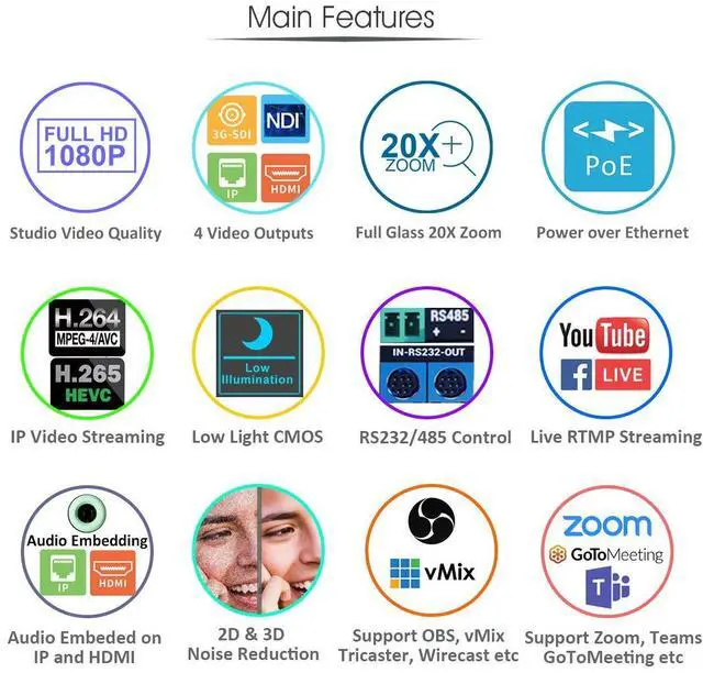Simultaneous 3G-SDI, HDMI and IP Live Streaming Video Outputs. PoE(802.3af) supported. Effective transmission distance is up to 492ft (150m) .Supports H.264/H.265 encoding which makes motion video more fluent and clear under low bandwidth conditions. Multi-ways to Control: RS232 & RS485 (Serial Joystick), IP(Webapp, IP Joystick, Phone App) & NDI(NDI tool/software). Installing AVKANS professional camcorder in the studio enables programs to be produced by a small number of people.