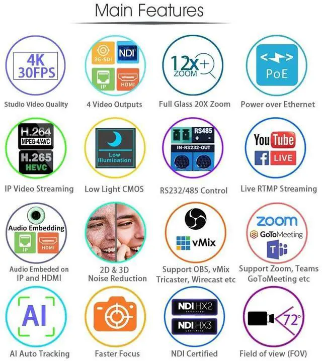 1. Compare to our competitor, AVKANS 4K Camera includes NDI License, No need EXTRA purchase. 2. THIS 4K CAMERA Includes 3G-SDI Video output, you don't have to purchase EXTRA devices like converter or extender for long cable runs.