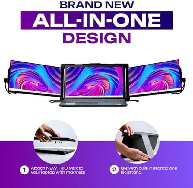 [(New All-in-One Design)] :The portable laptop monitor has the option to use magnets to attach the Trio Max to the laptop, or use our new built-in kickstand to leave the magnets behind. No more bulky clips to hold the screen in place.