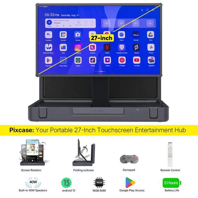 Portable Entertainment System: Designed for versatility and ease of use, Pixcase combines the functionality of a 27-inch 1080P touchscreen with the portability of a compact suitcase; It's perfect for outdoor gaming, movie streaming, or presentations ^^