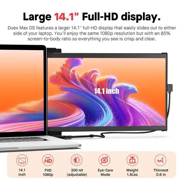 Setup: Make your workspace more comfy with the Duex Max DS 14-inch IPS screen; Unlike regular portable laptop monitors, our clever magnetic and sliding design smoothly extends your laptop screen ^^ Portable Convenience, Slim