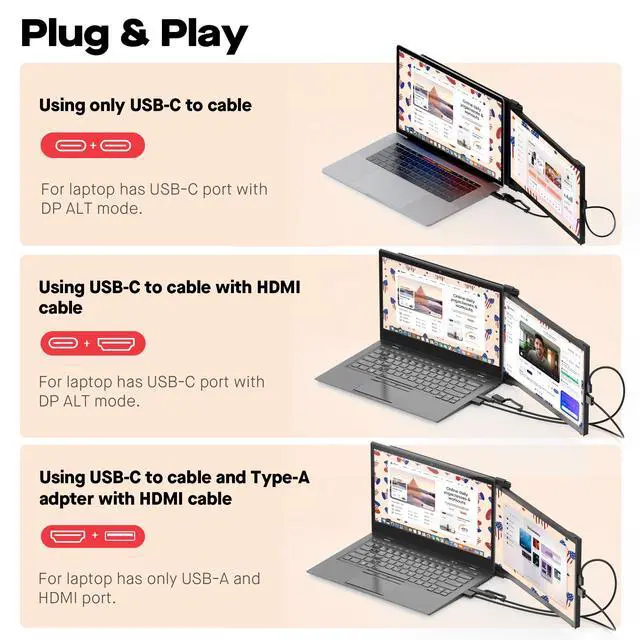Viewing Modes: Experience a new era of simplicity with our plug-and-play portable monitor; Bid adieu to complex setups and tangled cables simply connect via USB Type-C/HDMI and dive into a world of productivity ^^ Universal Compatibility, Endless