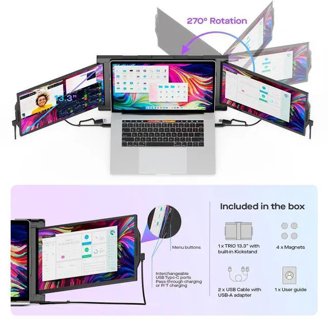 Play: The portable laptop monitor provides USB-A and USB-C connection options, only need to connect the cable to use, seamlessly integrate with Windows, macOS, Android smartphones and Switch ^^ New All-in-One DesignThe triple monitor has the option to use magnets to attach the Trio to the laptop, or use our new built-in kickstand to leave the magnets behind; No more bulky clips to hold the screen in place ^^ Personalized Settings AvailableThis monitor extender has two built-in sliding 1080p full HD displays, which can use eye protection mode and supports 0 to 270 degree rotation; Perfect for multitaskers, gamers, programmers and designers, and more ^^