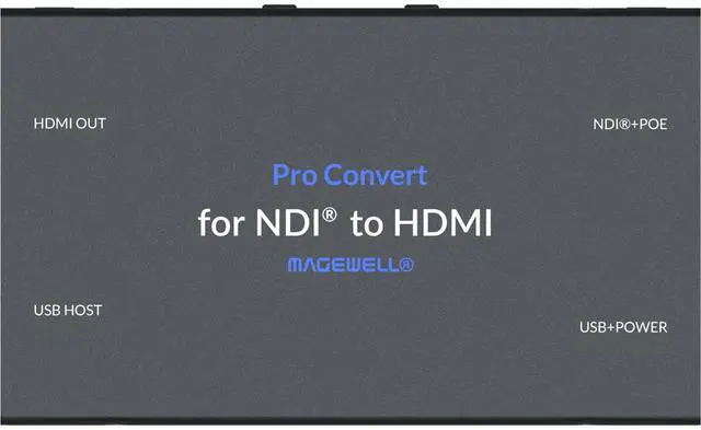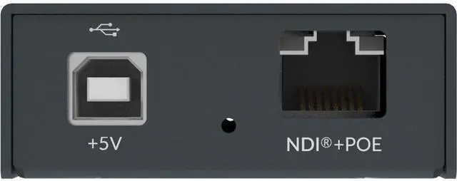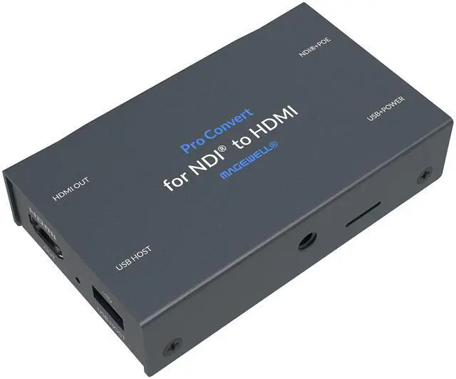 Decode NDI Streams to HDMI Converts full-bandwidth NDI and NDI^^HX streams to HDMI for seamless IP-to-display integration. ^^ High-Resolution HDMI Output Outputs resolutions up to 40962160 at 60 fps with automatic scaling and EDID-based optimization for connected displays. ^^ Advanced Video Processing Built-in processing supports de-interlacing, aspect ratio and frame rate conversion, color space adjustments, cropping, and scaling for optimal playback. ^^ Flexible Power & Network Control Operates via Power over Ethernet (PoE) or USB power, with full web-based configuration, HTTP API control, and support for central management systems.