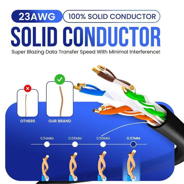 ^^: This blue Cat 6 Ethernet cable is constructed with premium 23 AWG Ethernet cable featuring 100% solid conductors. It guarantees exceptional signal quality and maximum conductivity. Our bulk Cat6 plenum cable minimizes signal loss over extended distances, ensuring superior bandwidth and enhanced durability.