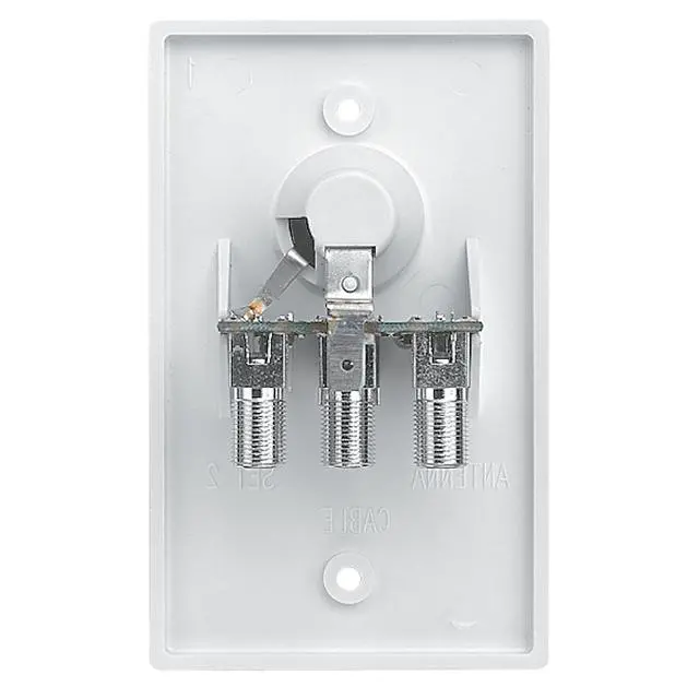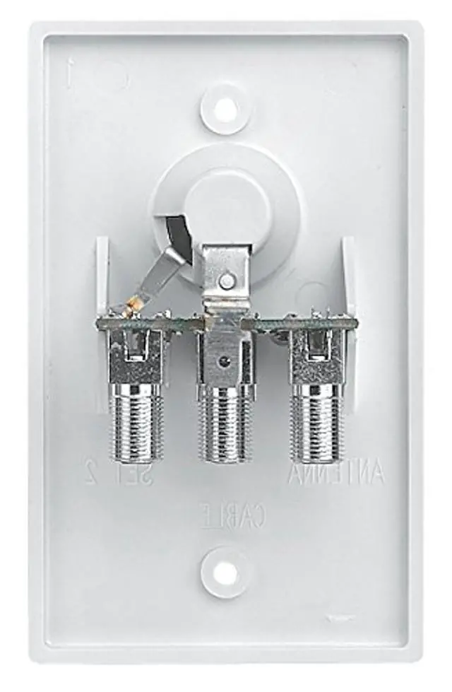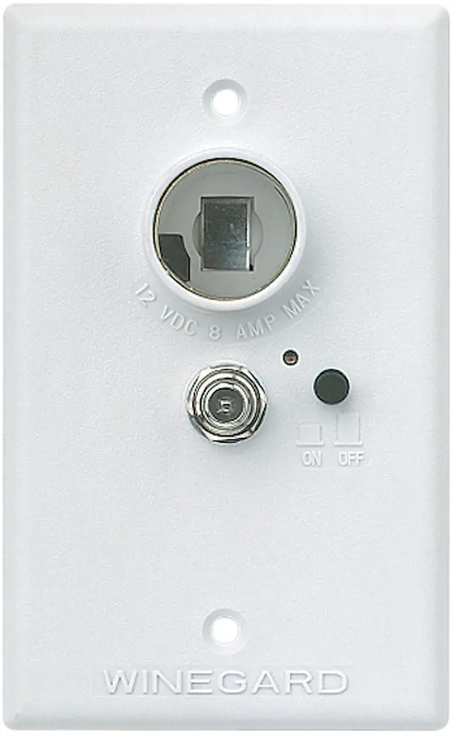 Wall Plate/Power Supply-Cable Ready. White is a 12 volt DC power supply with polyfuse in a flush wall plate. Features a 75 ohm coaxial input and output connection, 2-way splitter for a second TV, input switch for cable or RV antenna, + 12 volt DC cigarette lighter receptacle for TV set plug-in. Packed 1 per bag. Use with Winegard amplified antennas only.