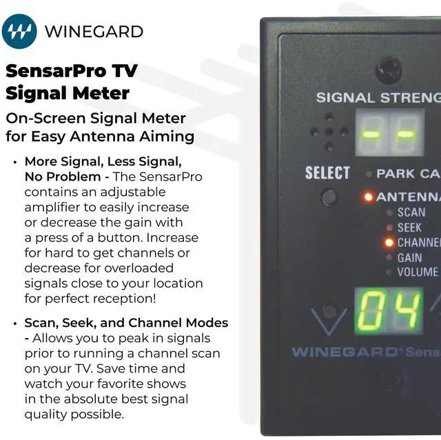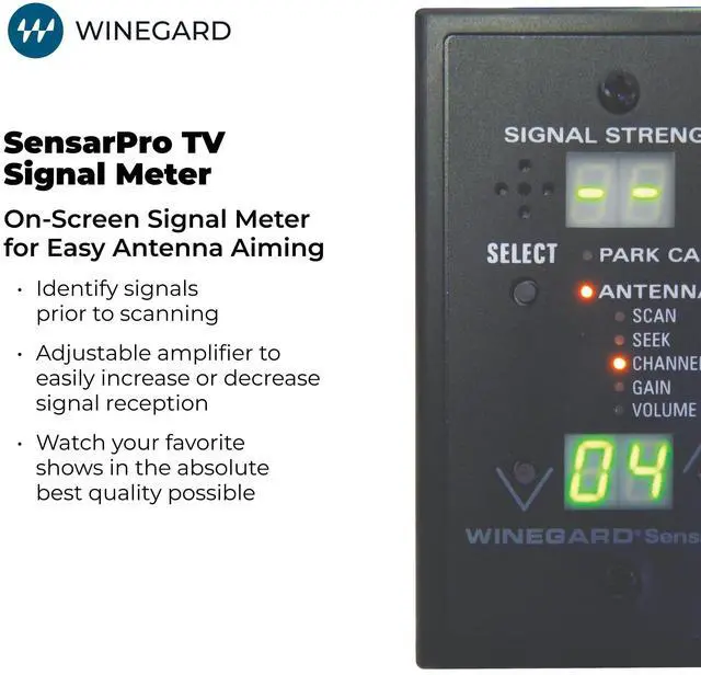 Tune in local programming fast and easy with the Winegard SensarPro signal strength meter. Basic operation is simple, just select foot scan foot mode and slowly rotate the Sensar antenna until the strongest signal strength is located then run a channel scan and you will be watching your favorite local broadcast shows in standard or crisp clear HD. Advanced search options are also available but not necessary for each use. The SensarPro has built in amplification to provide up to 10 decibel of gain for increased performance or the ability to lower the gain when positioned near a tower.