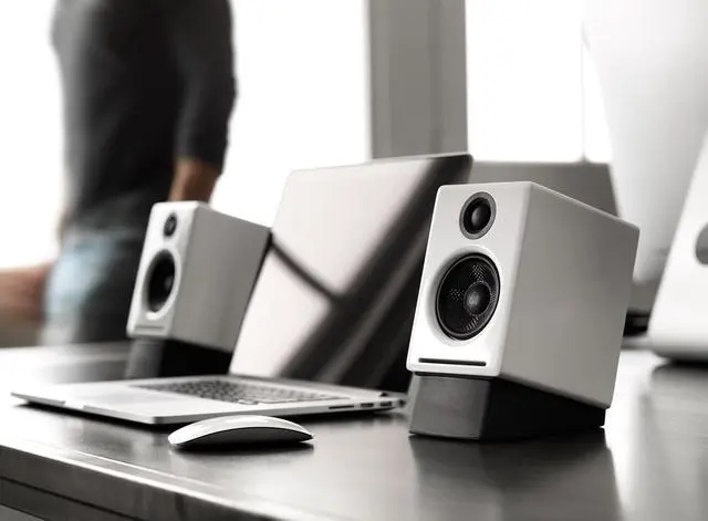 Audioengine A2 White Computer Speakers with S8 Black Subwoofer and DS1M Metal Stands