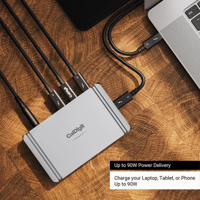 When you connect bandwidth intensive displays, the hub will enable Bandwidth Boost which will allocate more Throughput for the displays at up to 120Gb/s. This will leave 40Gb/s bandwidth for the rest of the hub. *Bandwidth Boost requires a compatible Thunderbolt 5 Mac or PC only. ^^ 90W Power Delivery - Charge your laptop, tablet, or phone with up to 90W sustained power delivery. The Element 5 Hubs compact and powerful 180W power supply allows the device to provide sustained power delivery at all times regardless of how many devices are connected to the hub.