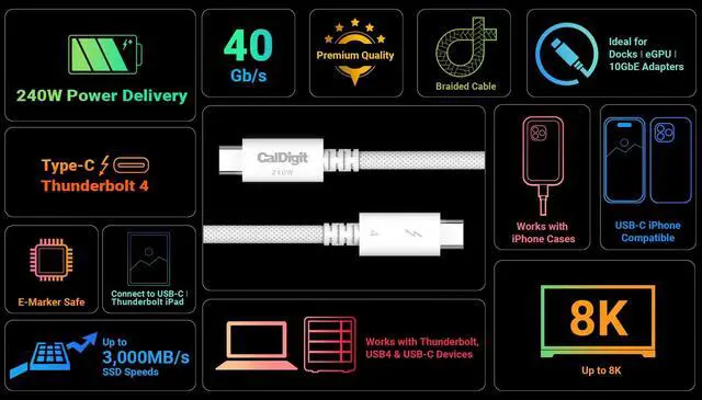 Supports display resolutions up to 8K@60Hz and 4K@144Hz. E-Marker equipped and Intel Thunderbolt Certified. **Requires a Thunderbolt 4 host device for maximum performance. Performance will be limited to the maximum specification of host port. ^^ Ideal for host devices such as 2016+ Macbook Pro, Macbook Air, 2017+ iMac, 2017+ iMac Pro, 2020+ Macbook Air, iPhone 17 Pro/Max, iPad Air & Pro, Windows Thunderbolt 3/4/5 Laptops & PCs ^^ CalDigit Thunderbolt Pro special edition cables are braided for increased durability, heat resistance and flexibility. This allows our Pro cables to increase the charging rate to 240W over our standard 100W Thunderbolt 4 cables ^^ Low Profile Connector - CalDigit Pro Thunderbolt cables offer significantly slimmer connector housings to allow functionality with phone cases and crowded ports.