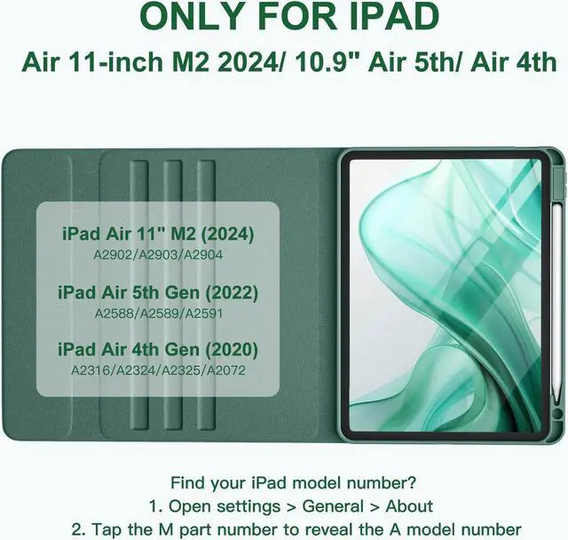 [(Compatibility)] This air keyboard case is compatible for iPad Air 11-inch (M2) 2024 (Model Number: A2902/AA2903/A2904), for iPad Air 5th Generation (Model Number: A2588/A2589/A2591), for iPad Air 4th Generation 10.9 inch (Model Number: A2316/A2324/A2325/A2072). Not for other devices. Please be kindly check the model number No. starting with the letter "A" of your tablet back before order