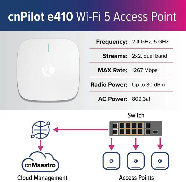 EFFECTIVE SOLUTIONS: The cnPilot e410 Indoor Wi-Fi Access Points are designed to scale, from small enterprises to K12 schools, the e410 AP feature an easy-to-install integrated bracket and is enterprise grade 802.11ac Wave 2. Wave 2 is a faster solution to joining wireless networks, providing the ability to process larger files and quick access to data. 5-year warranty from sale date.