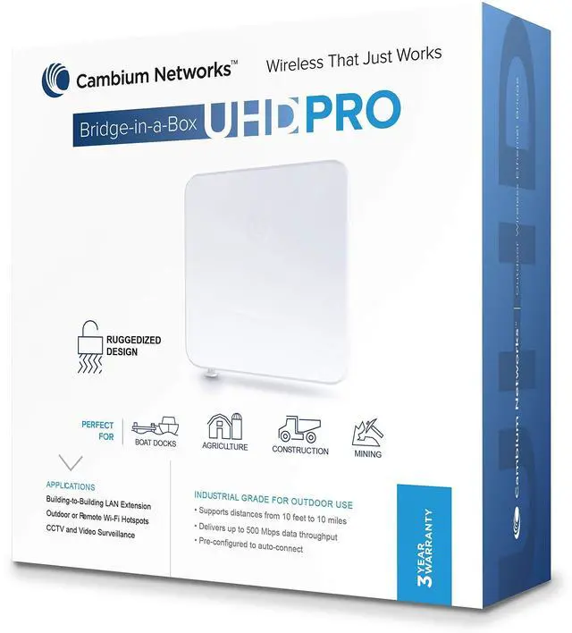 Thousands of small businesses and residential users are using Bridge-in-a-Box to wirelessly extend their networks by simply connecting point A to point B. Each Bridge-in-a-Box comes with two wireless radio modules and power supplies that can be used to extend your network from wherever you have an Ethernet port to wherever you need one from 50 feet to 5 miles away (20 meters to 8 kilometers). The modules are extremely easy to deploy as they come pre-configured and pre-paired to connect.