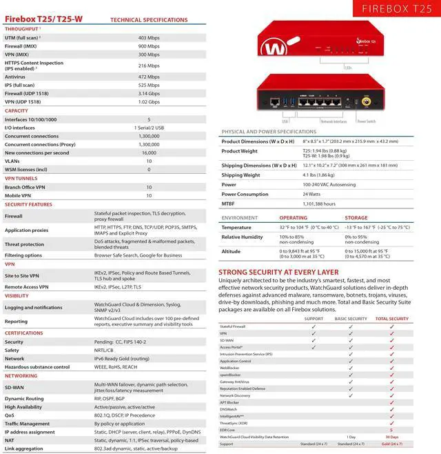Dual concurrent 5 GHz and 2.4 GHz radios. ^^ Zero-touch deployment makes it possible to eliminate much of the labor involved in setting up a Firebox to connect to your network - all without having to leave your office. A robust, Cloud-based deployment and configuration tool comes standard with WatchGuard Firebox appliances. Local staff connects the device to power and the Internet, and the appliance connects to the Cloud for all its configuration settings. ^^ The highly automated Firebox T25 is perfect for time-strapped IT teams. WatchGuards unique Automation Core ensures secure user access to essential resources, blocks advanced threats from entering your network, deploys and manages security offerings, and optimizes network performance while requiring minimal interaction from your IT team.
