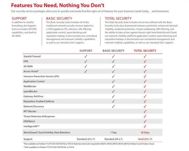 A robust, Cloud-based deployment and configuration tool comes standard with WatchGuard Firebox appliances. Local staff connects the device to power and the Internet, and the appliance connects to the Cloud for all its configuration settings. ^^ Firebox T45 models make network optimization easy. With integrated SD-WAN and optional 5G technology, you can ensure failover to the cellular network, minimize disruptive connectivity, and establish secure and reliable connections for small offices. ^^ Standard Support includes 24x7 access to technical support, with an unlimited number of incidents with a targeted response time of 24 hours for low priority, 8 hours for medium priority, 4 hours for high priority, and live calls for critical priority.