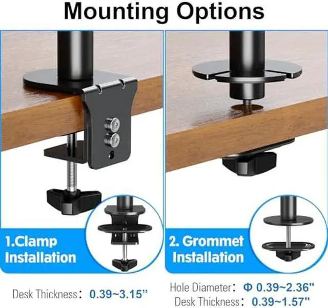 Stable Construction - Stacked monitors in one pole securely on the C-clamp or grommet. C clamps fit desk thicknesses up to 3.15" while grommet mounting works well with desk thicknesses up to 1.57". Meet your needs with different desks, stable and not easy t
