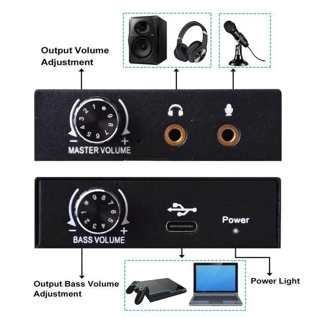 Bass Adjustment: The volume of the output audio can be adjusted with the master volume knob on the device. An output bass knob has been added to adjust the sound quality according to your needs.