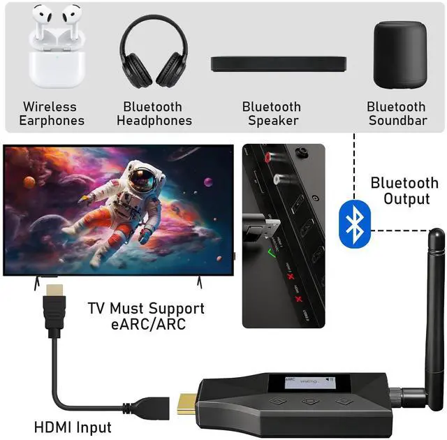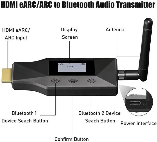 Package Includes: eARC/ARC Bluetooth Transmitter 1USB Power Cable 1HDMI Extension Cable 1Antenna 1