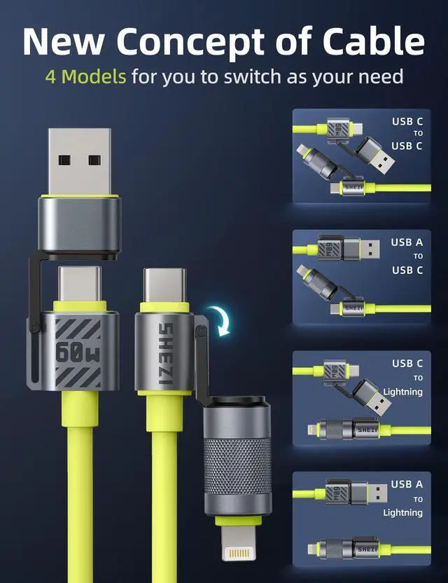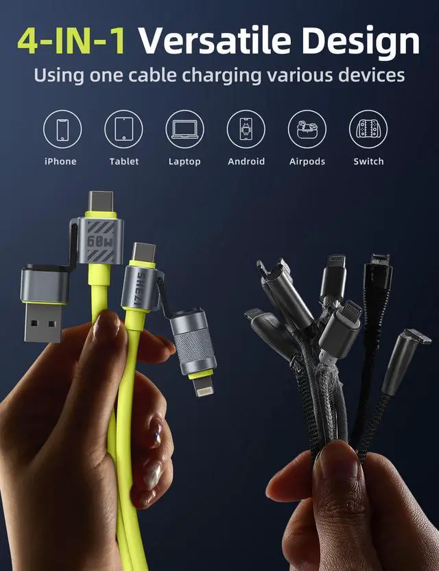 [(The All-Device Key & 4-in-1 Cable)] USB A+USB C+L+USB C= All your cables. Still bothered by having to carry a bunch of charging cables every time you travel? This Jixivor 4 in 1 charging cable is your ultimate gear. 4in1 fast charging cable features 4 ports: [USB C to USB C] [USB C to L] [USB A to USB C] [USB A to L], compatible with all your digital devices. Compatible with iPhone Samsung, Tablet, Air Mini Pro, Macbook and More. With just one charging cable, you can easily handle data transfer and charging. With this 4 in 1 usb cable in hand, you can take care of all charging needs