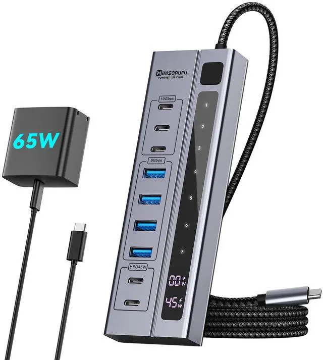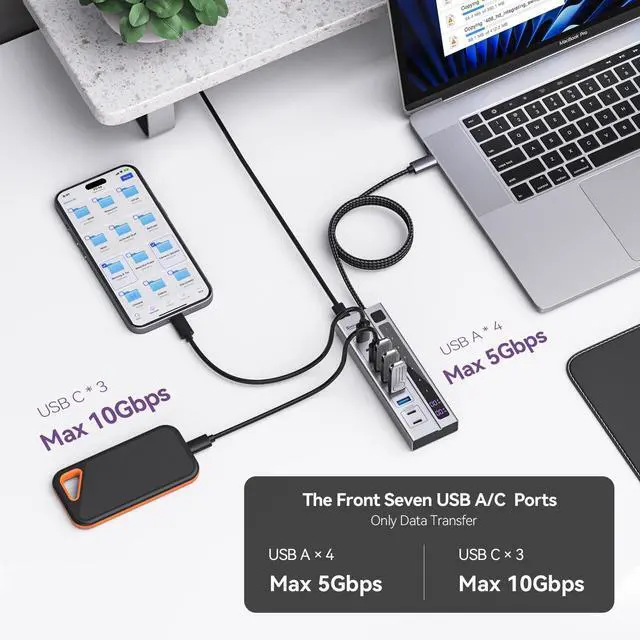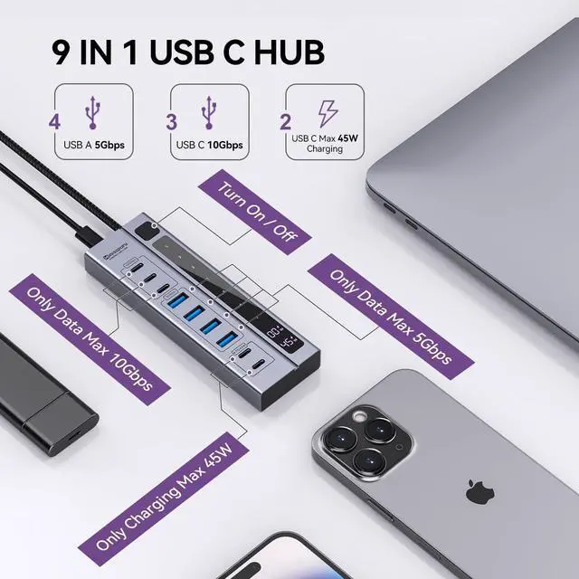 USB C Hub: The Powered USB Hub is equipped with 2* USBC (Single-Max 45W, Dual-Max 24W) charging ports, 4*USBA 3.0 data ports 5Gbps and 3*USBC 3.2 data ports 10Gbps.