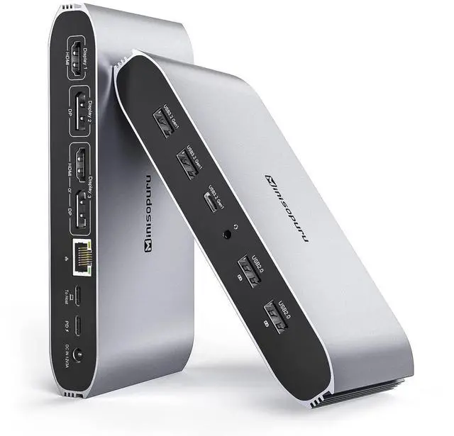 Extended: The Minisopuru displaylink dock with 36W power adapter expand 12 ports for daily use: 2*4K HDMI+ 2*4K displayport+2* 5Gbps USBA 3.2 Gen1 port (only data) + 5Gbps USB C 3.2 Gen1 port (only data) + 100W USB-C PD (Max) + 2*USBA 2.0 ports(data & charge)+ Gigabit Ethernet+ 3.5 mm audio/Mic jack.