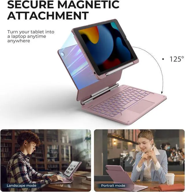 [(EASY-SET MAGNETIC STAND)] The durable aluminum alloy hinge guarantees a sturdy magnetic connection. Instantly transformed into a laptop, comfortably typing on your lap or on the table. The detachable PC case with built-in pencil holder offers a sturdy protection to your iPad and an quick pencil access. Enjoy a floating cantilever stand with customizable angles tailored for typing, reading, and immersive viewing. It's a perfect companion for travel, work, study and versatile daily use.