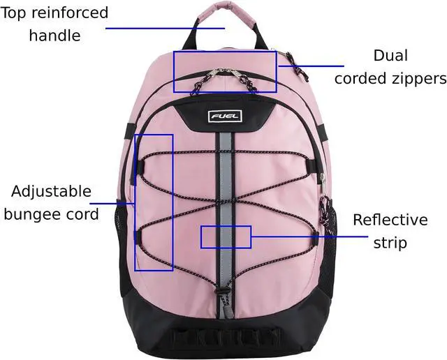 COMFORT: Adjustable padded straps, top reinforced handle, dual webbed side pockets for hydration, adjustable bungee cord, and dual corded zippers