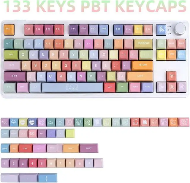 [(PBT & Dye Sublimation)] These keycaps made of PBT have excellent performance in terms of durability, bright colors, typing feel, and ease of cleaning, making it a very popular material in the keycap market. Compared with ABS, PBT has better high hardness, wear resistance and high temperature resistance. Advanced dye sublimation technology, the color pattern is more vivid, not afraid of oil stains, and has a long service life.