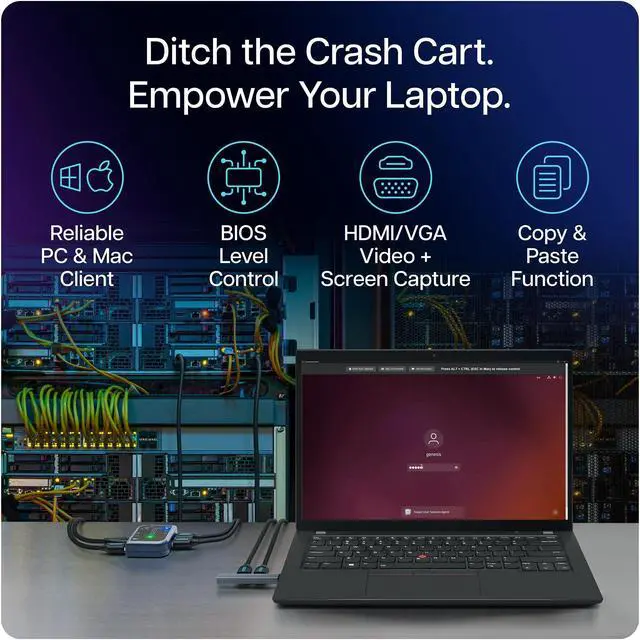 NO CONFIG HASSLES. Easily connect the portable crash cart and control any server from your laptop without installing drivers or software on the target server: works for MacOS (Sonoma and beyond) and Windows (Windows 10 and beyond)